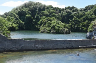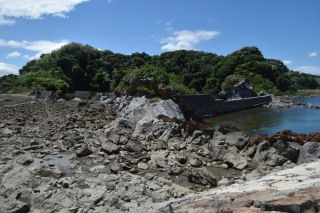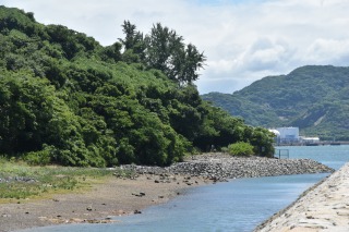 ![]() 写真1 南東より島を望む。潮が引き、右に海水が取り残されている |