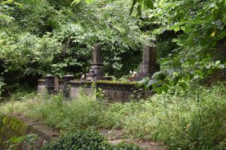 過去の地形図にある墓地を捜したところ、道路脇に現在も参られている墓地(鹿山家・橋村家)を見つけることができた。