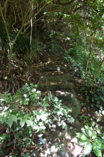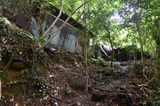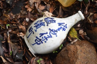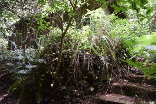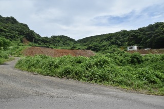 ここから谷に沿って進むと墓地(鹿山家)がある。さらに後方の斜面で、2箇所の屋敷跡が見られた。なおかつては広い谷に沿って農地が開かれていたが、現在は採石が行われたような痕跡が見られる。またその周囲も広く切り開かれ、太陽光発電の用地になっている。