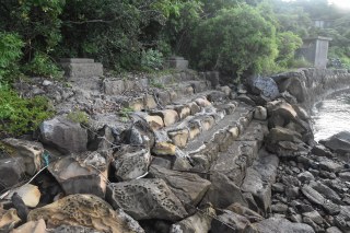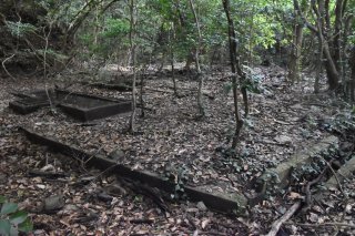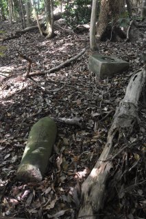 ![]() 写真24 倒れた石塔(左下)。右上に基部が見える |