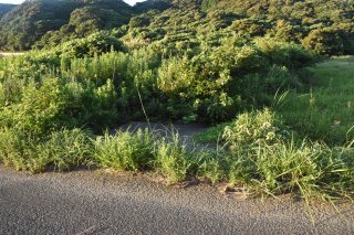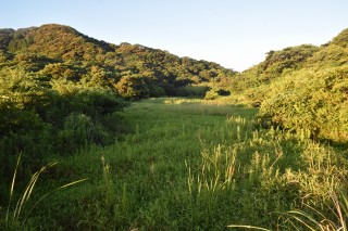 旧版地形図では谷に沿って水田が見られ、東の海沿いに建物が記されている(あるいは破線の道か)。