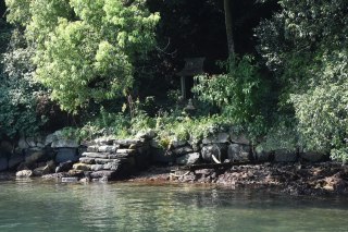 現地では、作業所や家屋のような造りの建造物が南東部に集まっている。また山裾には「宝塔」と刻まれた石塔が見られた。頂上では特に何も見られず。 なお島を離れる際に、島の北岸に2つの小祠を確認。しかし接岸が不可能であったため、詳細を確かめることはできなかった(写真4)。