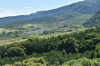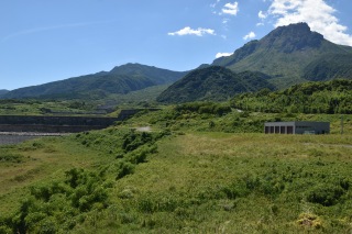 ![]() 写真1 砂防堰堤より集落跡を望む。左は水無川、右上は平成新山。建物は用途不明だが、近年建てられた新しいもの |